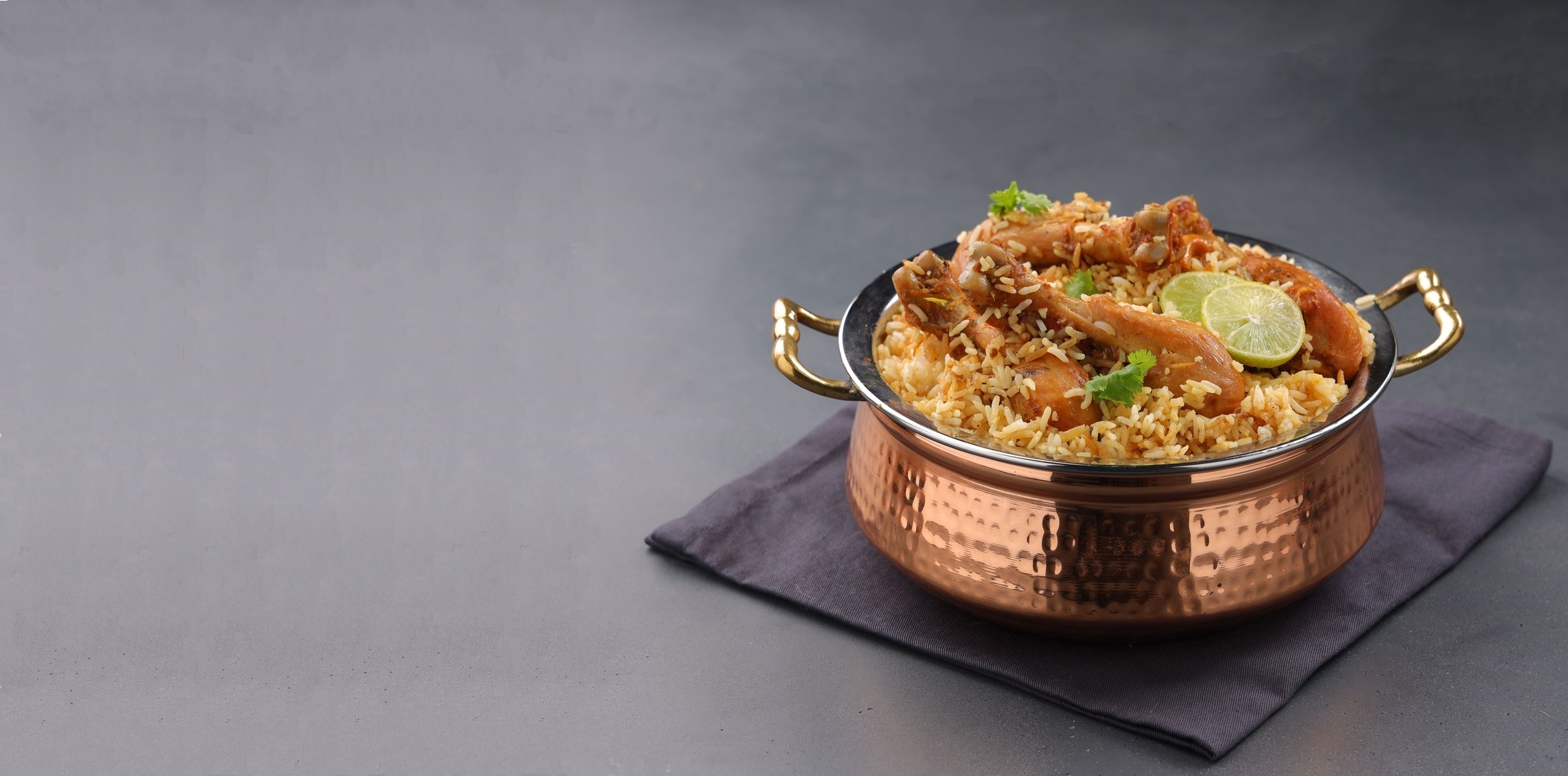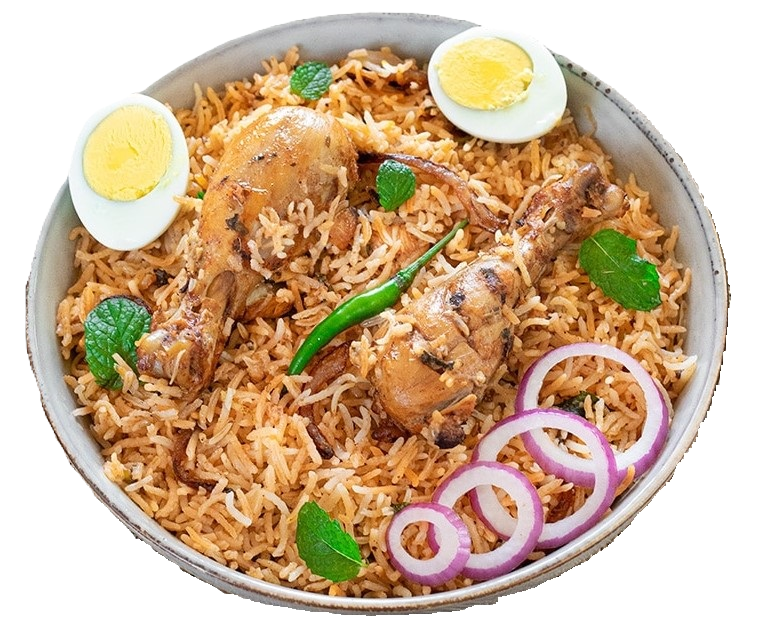 Indulge in Dum Biryani with succulent chicken, aromatic rice (0.5 kg), and Complete your takeaway experience with complimentary Raita, Brinjal Curry, and a boiled Egg.